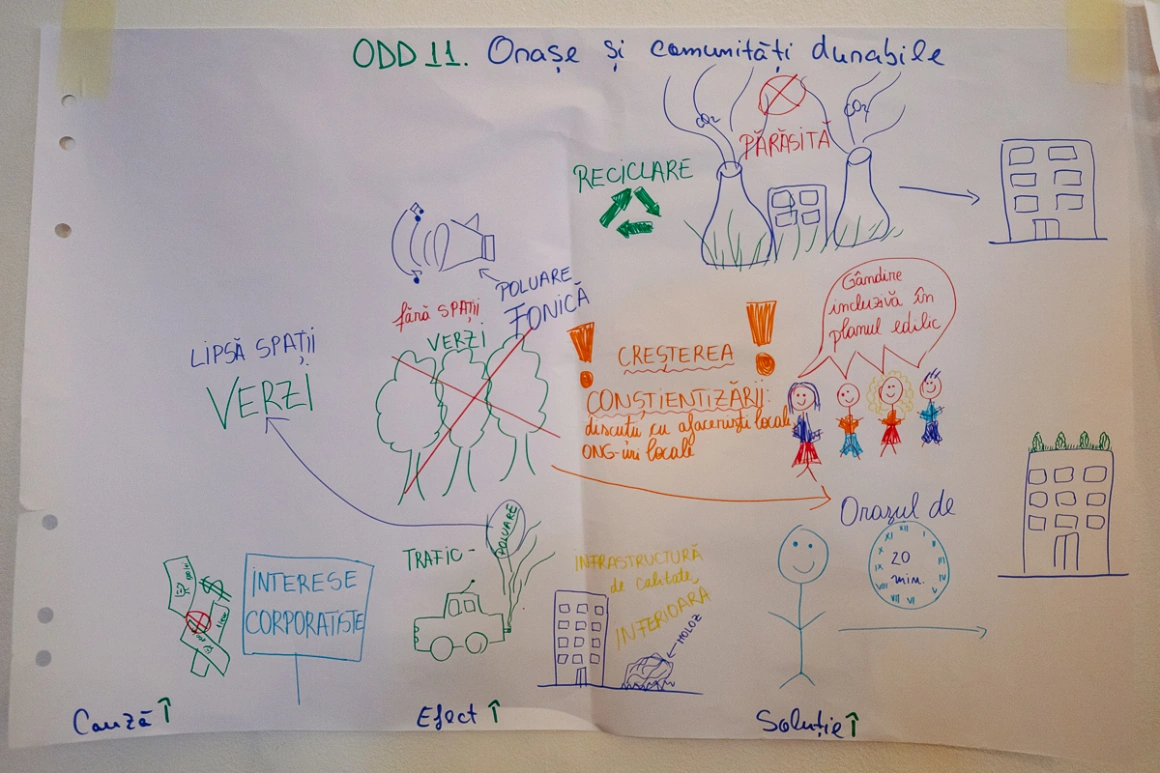 Exercițiul cu schemă de cauză - efect - soluție pe ODD 12 pe care l-a coordonat Iarina l-au făcut elevii după ce Teia Ciulacu, fondatoarea Viitorul Plus, le-a vorbit despre cum statele membre ONU s-au angajat să construiască un viitor mai bun. La baza acestei promisiuni stau cele 17 Obiective de Dezvoltare Durabilă, adică până în 2030, țările trebuie să combată sărăcia, foametea, injustiția, inegalitatea, să garanteze educație egală, accesul tuturor la locuințe de calitate, să ia măsuri de combatere a schimbărilor climatice și așa mai departe.