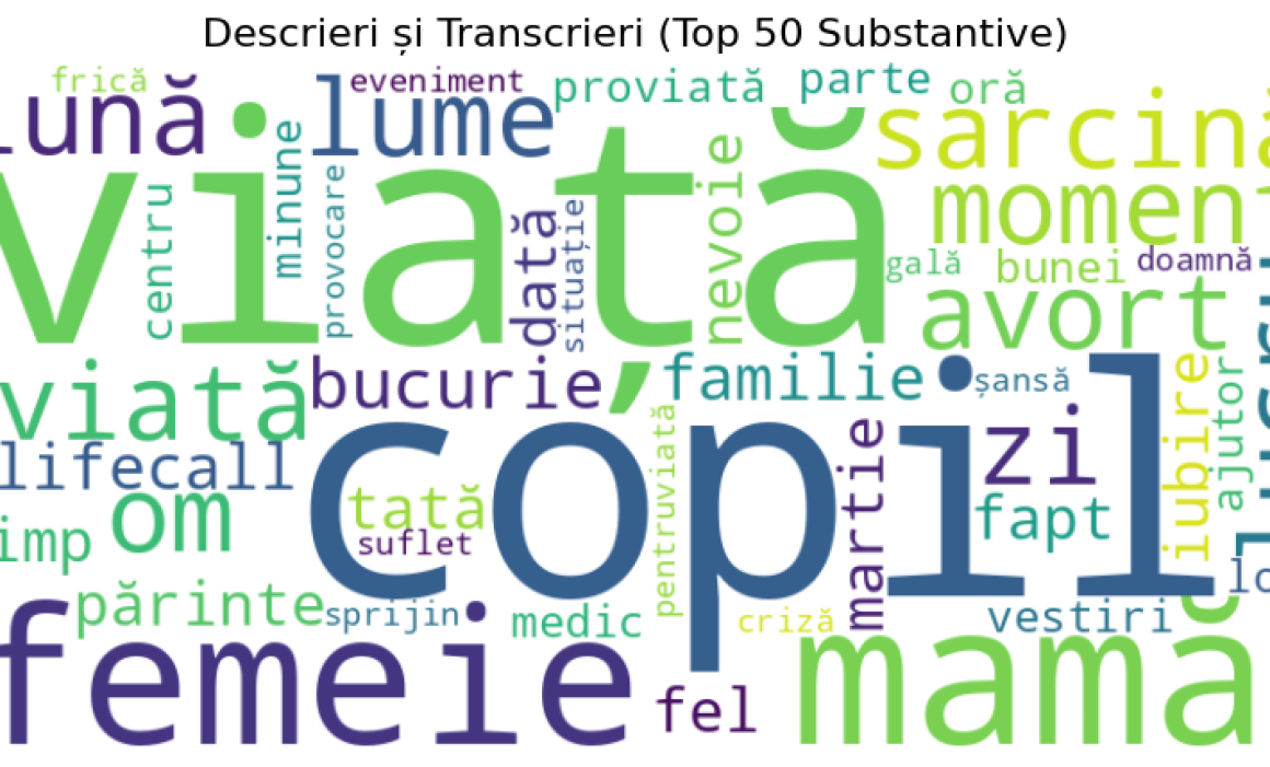 Pentru a avea o imagine vizuală asupra cuvintelor folosite în videoclipuri, am selectat, cu ajutorul unor tehnici de Natural Language Processing, cele mai folosite 50 de substantive din descrierile video-urilor şi transcrierile acestora pentru a genera un word cloud, în care cuvintele cele mai folosite au dimensiunea fontului mai mare.