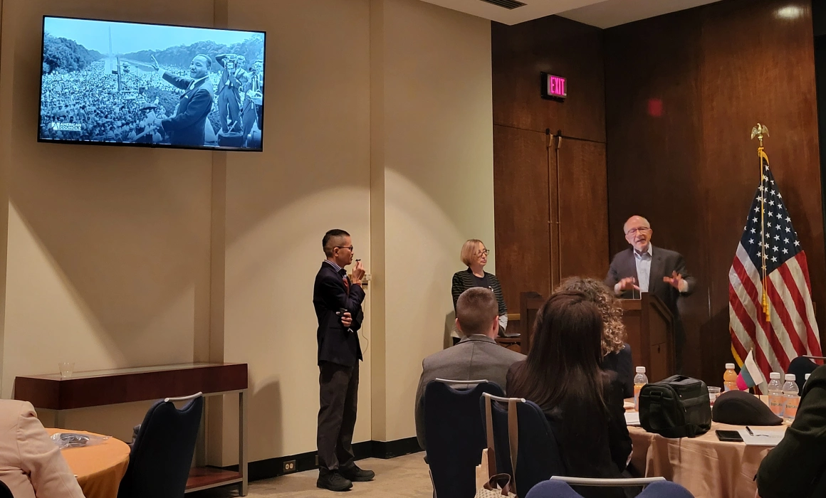 Somonul corporatist stă îngrămădit lângă legume coapte. Suntem la Librăria Congresului, unde Dan Davidson, lingvist și profesor emerit la Bryn Mawr College, unul dintre fondatorii American Council for International Education, explică tuturor delegațiilor ce înseamnă azi „pursuing The American Dream”. Suntem români, moldoveni, bulgari, vietnamezi, ucraineni.