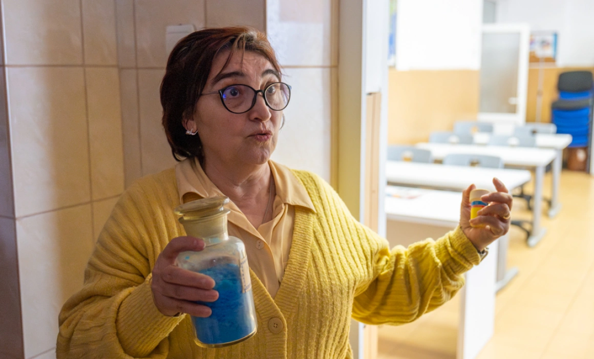 Are în laborator colorant alimentar, sodă caustică, zahar cubic și tot felul de substanțe în recipiente de toate mărimile. Cele mai proaspete au ajuns în laborator printr-un proiect și sunt în niște borcane mici pe unul dintre rafturile laboratorului. „Am râs să mă prăpădesc”, spune profesoara făcând referire la cantitatea mică de substanță și duce mâna spre unul dintre borcane.