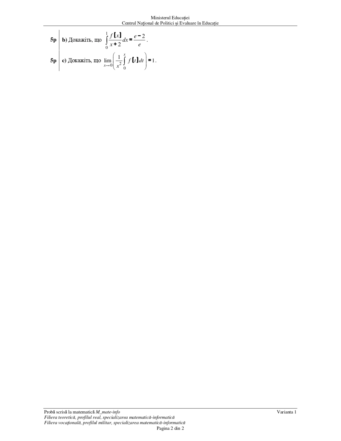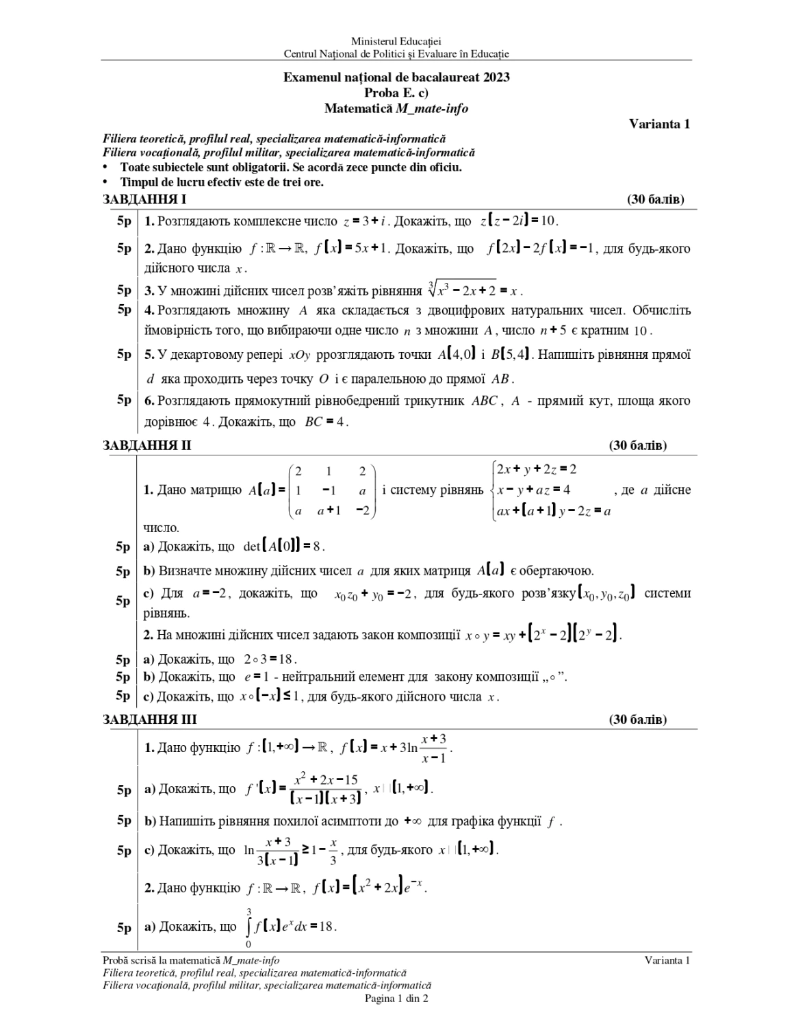 Mai jos găsiți și subiectele la Matematică, varianta M1, pentru elevii de la profilul Matematică-Informatică: