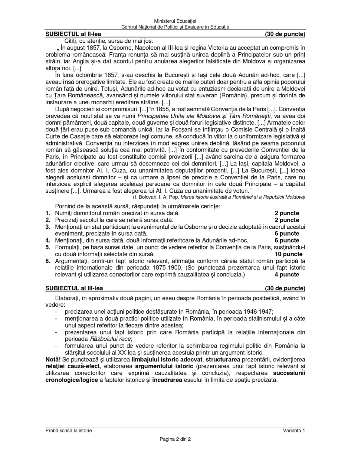 La Subiectul al III-lea de la Istorie, candidații au primit cerința: „elaborați în aproximativ două pagini, un eseu despre situația internă și internațională a României în perioada postbelică”. Au avut și un subpunct despre Războiul Rece. De asemenea, la primul subiect au avut cerințe legate de Evul Mediu și la cel de-al doilea subiect despre Unirea înfăptuită de Alexandru Ioan Cuza și criza orientală.