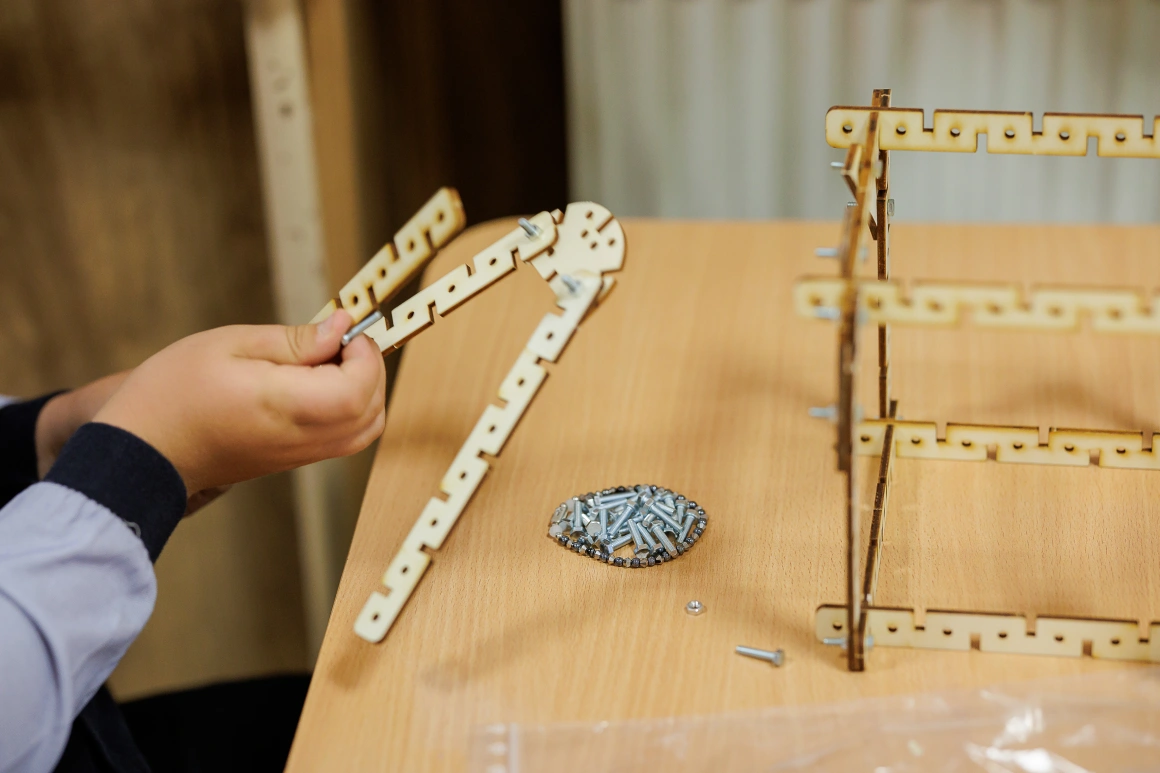 Când nu asamblează corect, copiii sunt nevoiți să desfacă șuruburile și să o ia de la capăt. Dar nimeni nu se supără. Sunt concentrați, au zâmbetul până la urechi și anticipează de multe ori care e următorul pas.