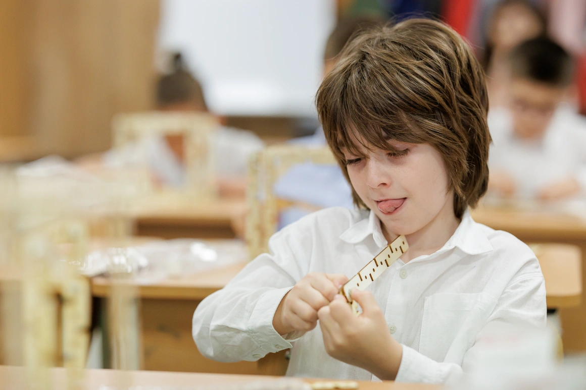 Șuruburile și piulițele mai cad pe jos. În a treia bancă de la geam, un băiețel a inventat propriul sistem prin care să le păstreze pe bancă. Și-a dat jos brățara de la mână și le-a pus în interior.
