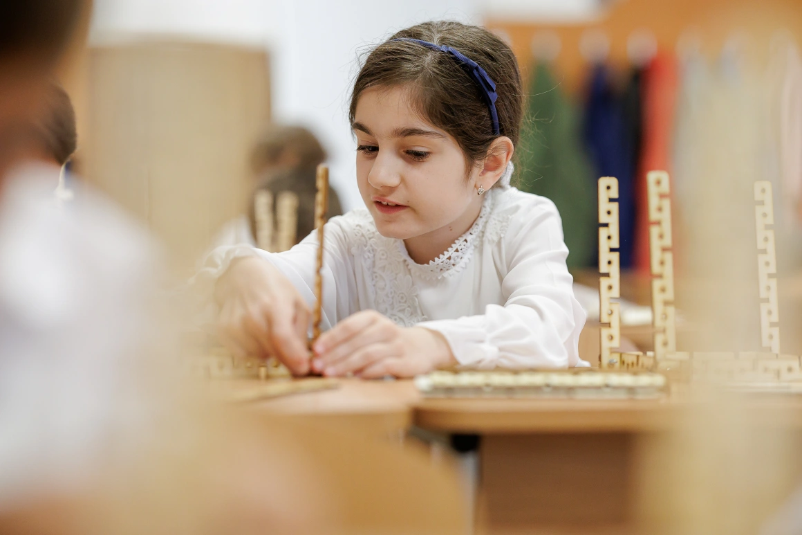 O fetiță cu două clame roz neon și puf de aceeași culoare se uită mândră la fundația și la stâlpii pe care tocmai i-a construit. „Este foarte bine”, o încurajează învățătoarea Diana.