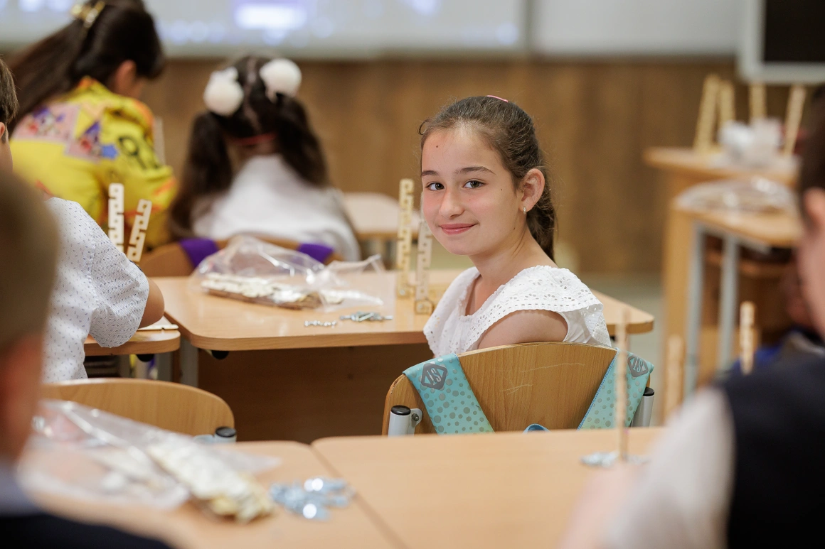 E luni, puțin trecut de ora 10. 18 elevi sunt prezenți. Doar unul lipsește. Toți sunt îmbrăcați în alb și albastru, iar fetele poartă pampoane albe și cozi împletite.