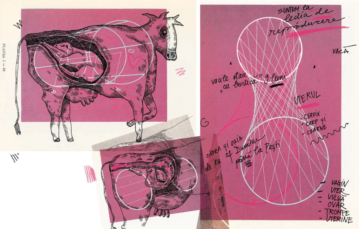 După o mică recapitulare din ce-și aduc aminte, profesoara le cere să se uite pe foile de lucru, să vadă organele esențiale. „Câte părți are uterul, Andrei?” Îi desemnează pe cei care se uită pe geam, în stânga sau în dreapta, nu în foi, și e fericită când răspund corect chiar și-așa. „Trei părți: cervix, corp și coarne”, răspunde băiatul, iar Andriucă îi ajută să țină minte spunându-le că, la vacă, coarnele din uter au forma coarnelor de berbec.