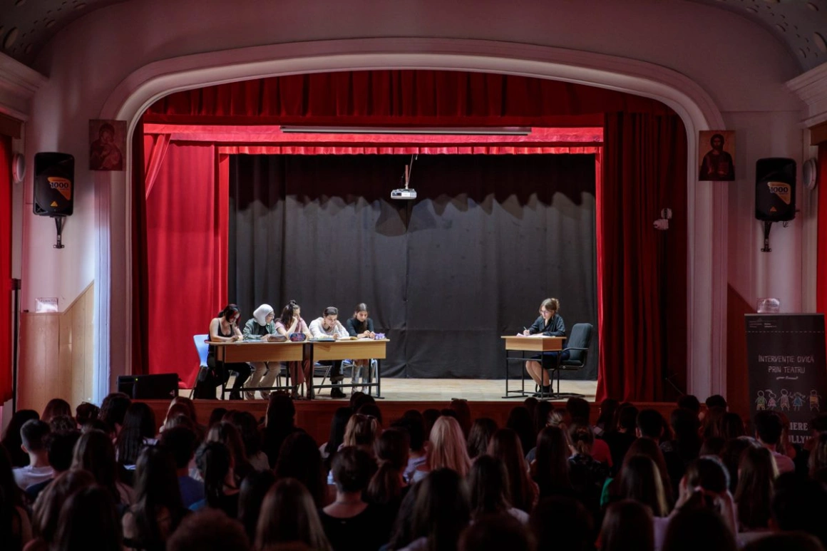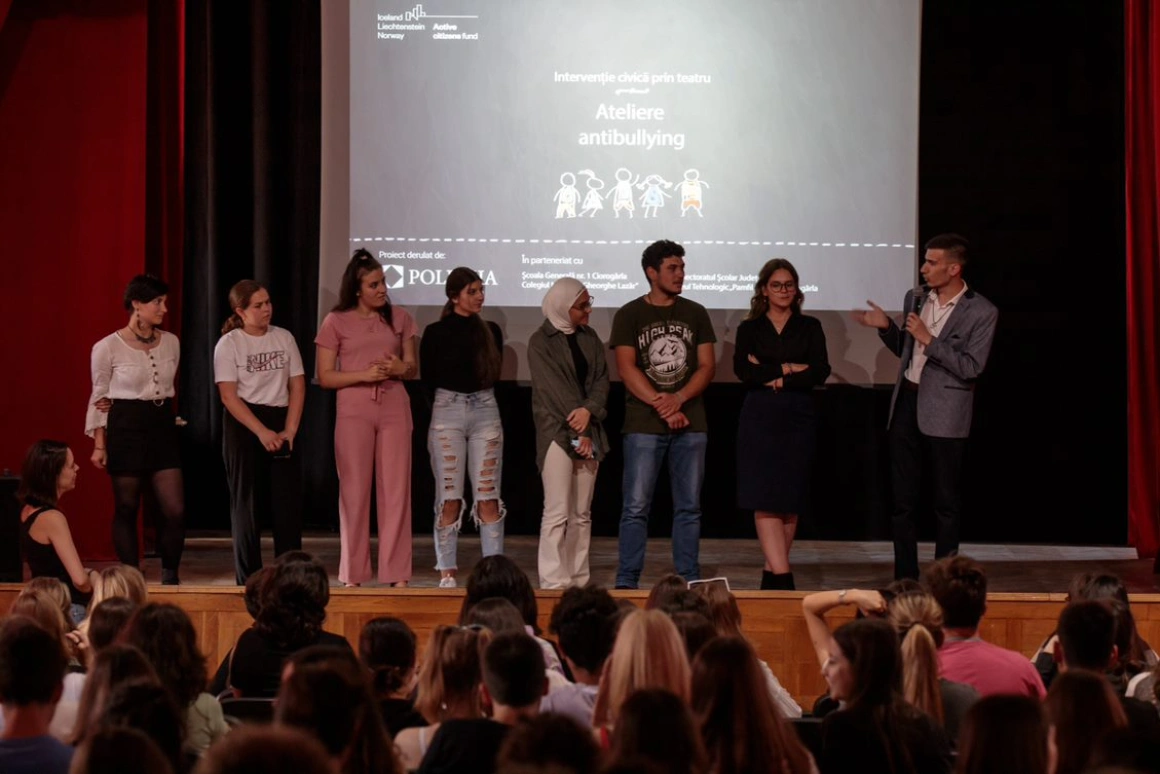 Asistăm la o piesă de teatru anti-bullying pusă în scenă de elevi ai Liceului Tehnologic „Pamfil Șeicaru” din Ciorogârla, în parteneriat cu elevi ai Colegiului Național „Gheorghe Lazăr”, din București.