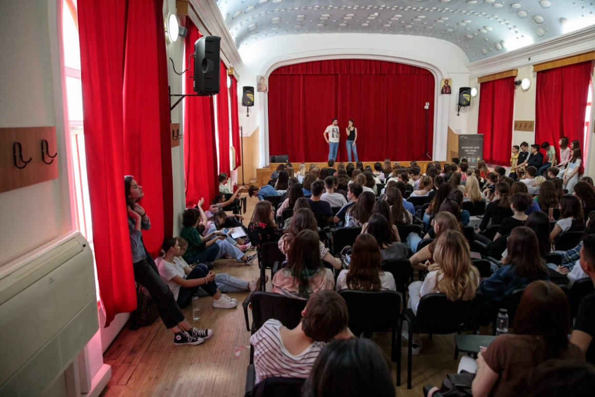 „Stop! E foarte bine, doar să vorbiți puțin mai tare, vă rog, nu ne ajută acustica sălii”, vin indicațiile din partea actorului Andrei Șerban, unul dintre coordonatorii elevilor. Se trage cortina, iar sala se umple rapid de zeci de elevi și profesori ai Colegiului Național. Scaunele nu sunt de ajuns, unii elevi se așază direct pe podea. Se lasă apoi liniștea.