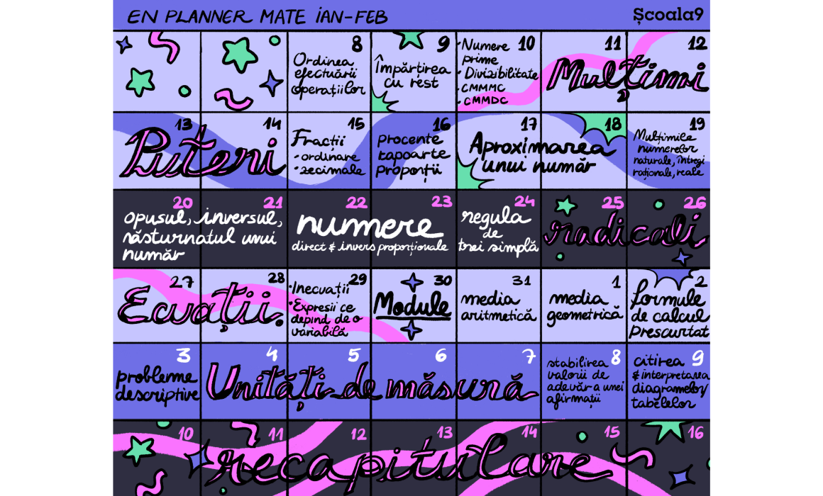 Începem în forță anul cu prima serie de plannere pentru Evaluarea Națională și continuăm, după limba și literatura română, cu un calendar pentru lunile ianuarie și februarie pentru matematică. Liliana Mitre Sirețchi, profesoară de matematică și cofondatoare a platformei educaționale SuperȘcoala, a pregătit explicații video pentru toate tipurile de exerciții de la primul subiect de pe foaia de examen.