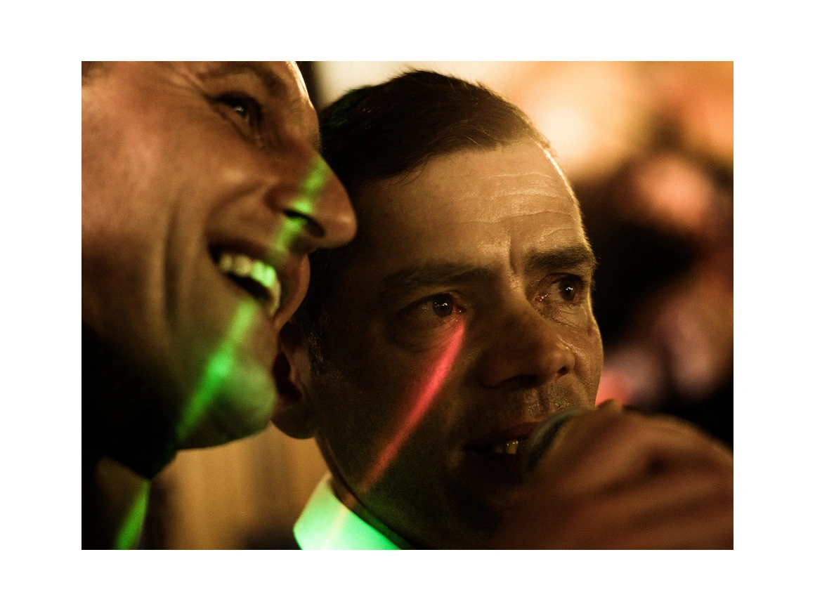 Un bărbat înalt cu ochi albaștri transmitea și el live și descria atmosfera pentru cei care nu au ajuns: „Oameni dragi, prieteni, petrecere și voie bună”. Băieții plecați în străinătate îi scriau pe Facebook că-i mulțumesc că-i ajută să se simtă și ei parte din reuniune. O fostă educatoare a comentat că-i pare rău că nu e acolo. „Chiar mi-aș fi dorit să veniți, doamna”, i-a răspuns în filmare. S-a îndreptat apoi spre masa unde stăteau soția și fiica lui și le-a filmat mândru: „Familia mea”. „Ai o familie frumoasă. Să nu-ți pierzi zâmbetul niciodată.” „N-o să mi-l pierd”, i-a răspuns și aproape i-au dat lacrimile.