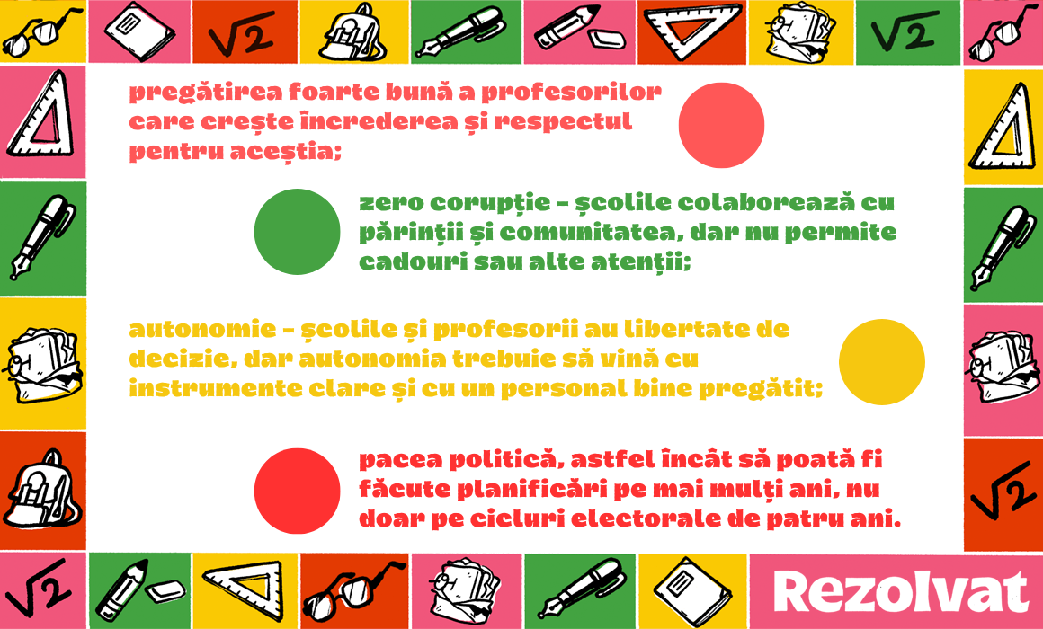 pregătirea foarte bună a profesorilor care crește încrederea și respectul pentru aceștia ca profesioniști și o plată adecvată care îi face motivați;