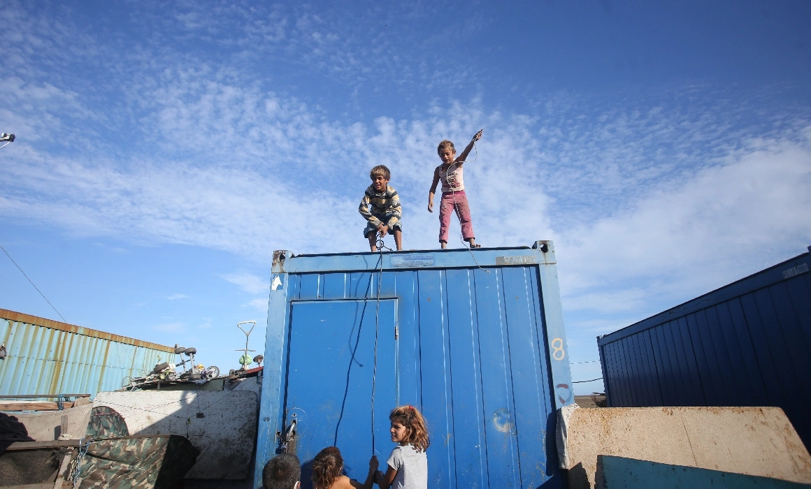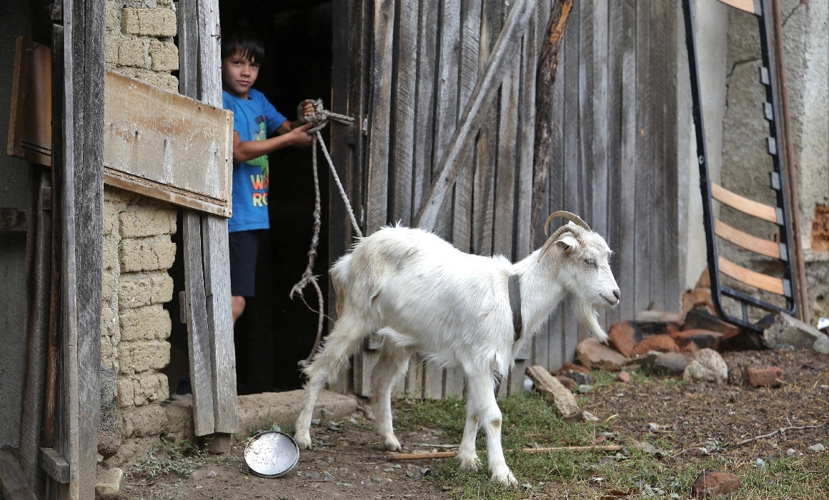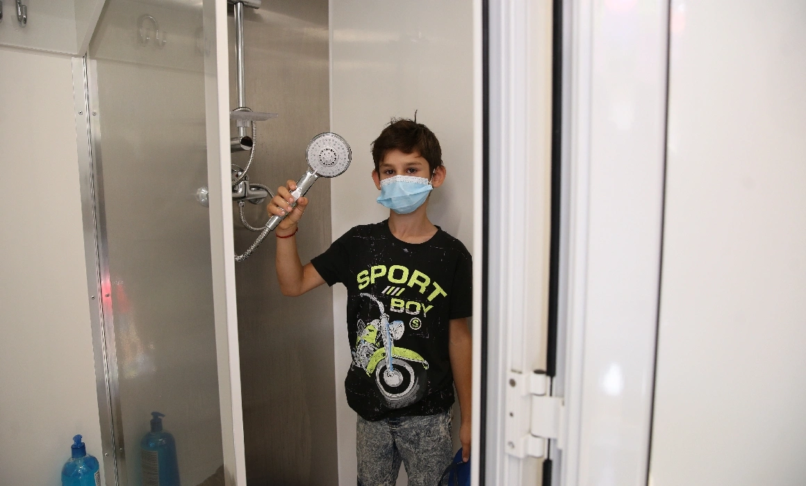 Foto: Vlad Chirea (Un copil se spală pe mâini, înainte de a intra în clasă, la școala din comuna Bucinișu, județul Olt. În lipsa apei curente și a canalizării, directorul școlii a fost nevoit să improvizeze un sistem de chiuvete și bidoane cu apă mobile, la care copiii să se poată spăla pe mâini. Bucinișu, Olt, 19 septembrie 2020)
