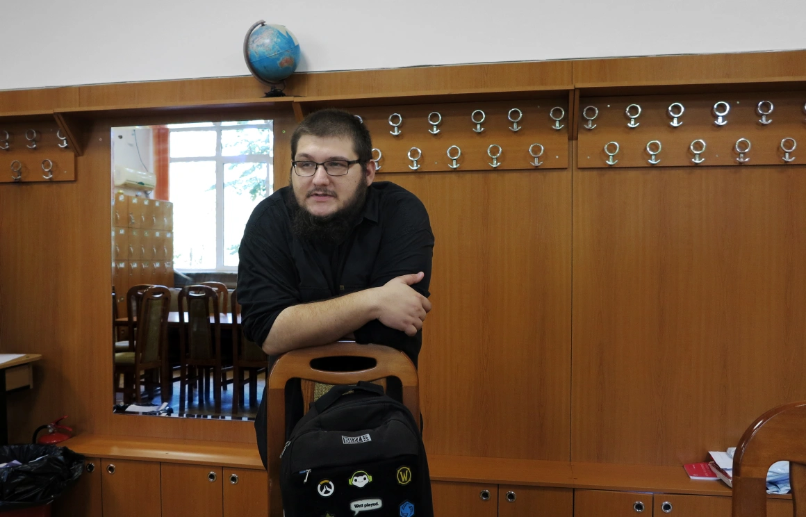 În timp ce elevii de-a IX-a fac exerciții câte trei, pe grupe, el se plimbă printre ei ușor aplecat în față, cu mâinile la spate. E în al treilea an de predare și deja a înființat un club de dezbatere, iar anul acesta va preda și patru ore din opționalul de „Dezbatere, oratorie și retorică” la clasa a XI-a și a XII-a. Spune că se gândește să înceapă chiar cu Retorica lui Aristotel, să îi îndrume pe elevi pe o cale mai filosofică. „Nu mă mulțumește că știu logică, vreau mai mult, vreau să-i fac morali.”