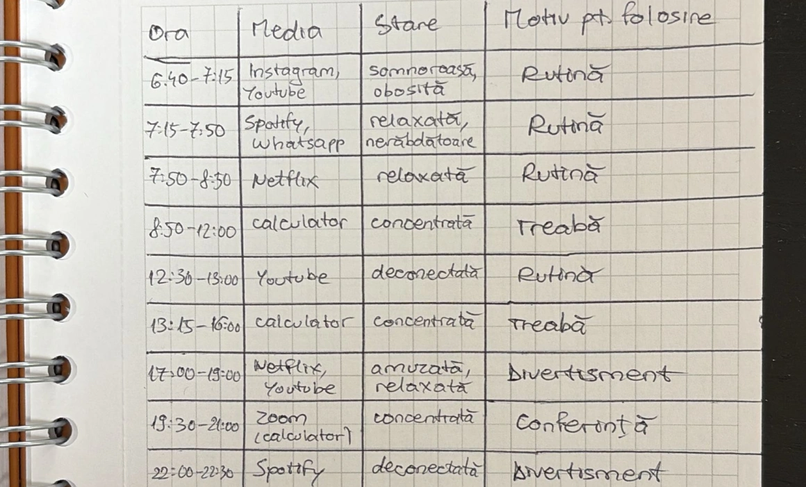 Ea are un truc care crede că ar putea să le folosească și altora: ține un fel de jurnal digital. „La fiecare 10 clipuri pe care le văd pe Instagram, indiferent că stau o secundă pe fiecare sau 10 secunde, opresc telefonul și îmi scriu într-un jurnal ce impresie mi-a lăsat fiecare clip. Așa îmi dau seama ce tip de conținut ar trebui să consum mai mult”, explică eleva.