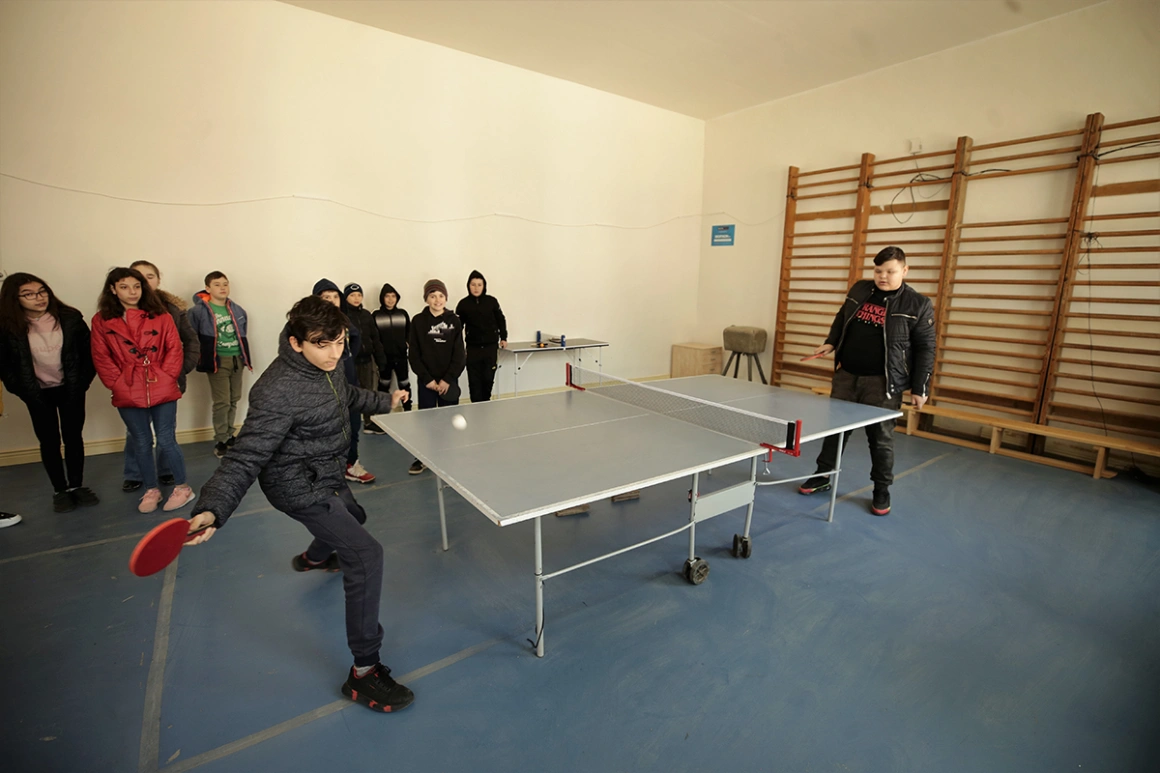 Copiii zâmbesc larg și țopăie pe lângă director, care le vorbește prietenos. Abia așteaptă să învețe în noua clădire. Până atunci, ne conduc în sala de sport pentru o mică demonstrație de tenis de masă. Sala de sport, care are 60 de metri pătrați, este dotată cu o sală pentru ping pong și alte echipamente sportive. Intră în joc doi băieți, cei mai buni din clasă, după cum îi laudă colegii lor.