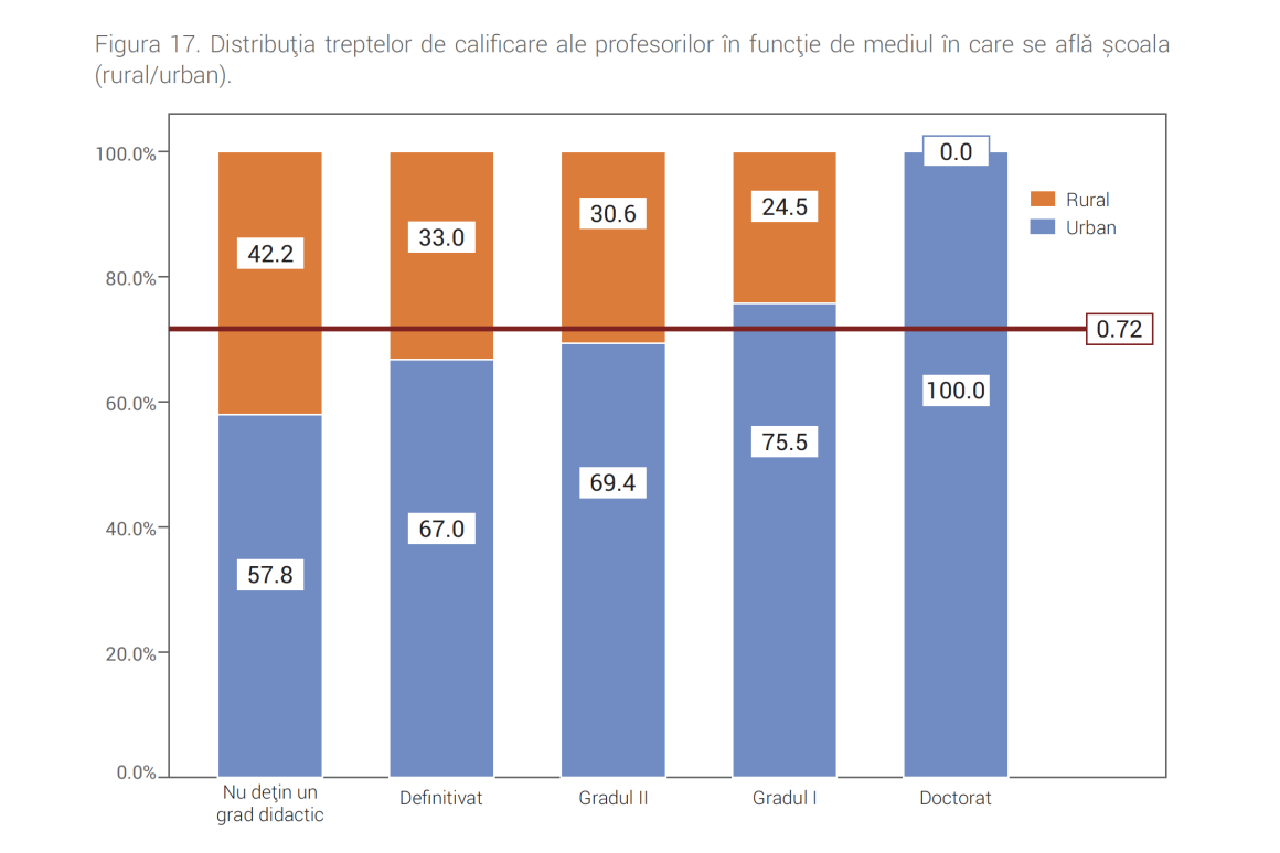 Studiul arată măsura în care sistemul de educație este inechitabil, în special când compari școlile din rural cu cele din urban. Școlile de la sate tind să aibă proporții mai ridicate de profesori tineri și de profesori la finalul carierei. De asemenea, tind să aibă în medie profesori mai puțin calificați decât cei din urban; de aceea, salariile profesorilor din rural sunt mai mici decât cele din urban. Mai mult, diferența de calificare este mult mai accentuată în favoarea celor din urban la profesorii de materii esențiale – matematică și limba română, care sunt disciplinele testate la Evaluarea Națională și de care depinde admiterea la liceu – și la informatică și limbi străine, materii care oferă avantaje pe piața muncii. Iar această inegalitate din sistemul de educație, spun autorii, contribuie la creșterea inegalităților economice și de reprezentare politică.