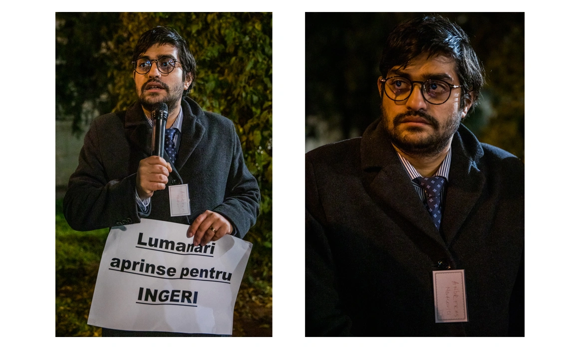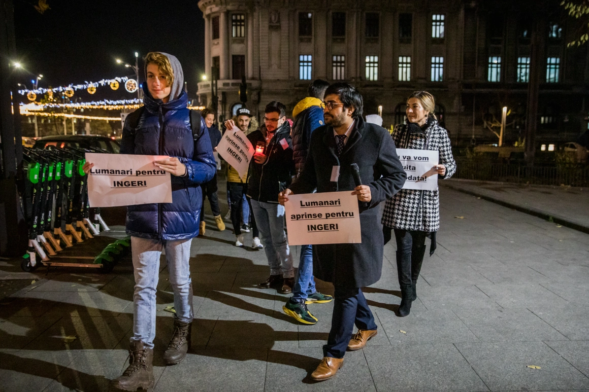 Un grup de vreo 20 de persoane, flancat de vreo 10 jandarmi, dârdâie pe trotuarul din fața Ministerului Muncii și Protecției Sociale din București. Li s-au învinețit mâinile pe lumânările mici și albe pe care se chinuie să le țină aprinse și să le aranjeze în formă de înger, în ciuda vântului tăios din seara de Moș Nicolae.