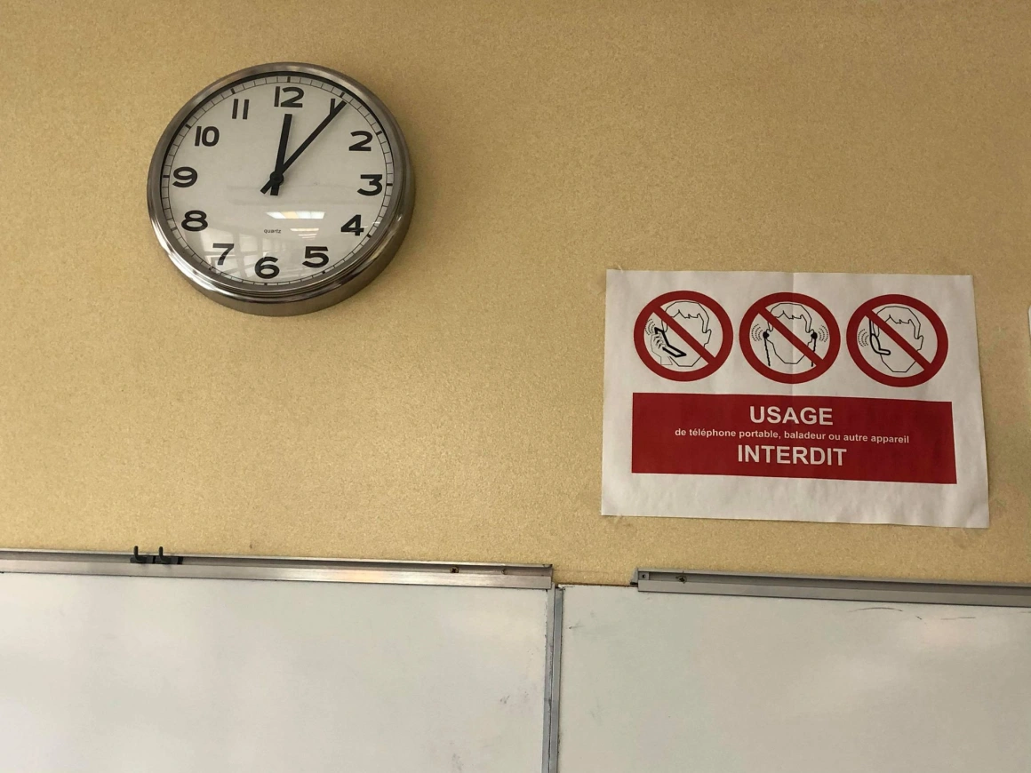 Elevii intră în clasă, bonjour, se așază fiecare unde vrea. Pe catedră se află un gel de mâini, dar nimeni nu îl folosește acum. Deasupra tablei e o poză cu ce nu ai voie să faci în clasă: să vorbești la telefon, să porți căștile în ureche sau să ai cască bluetooth.