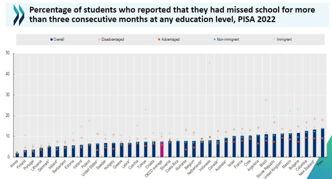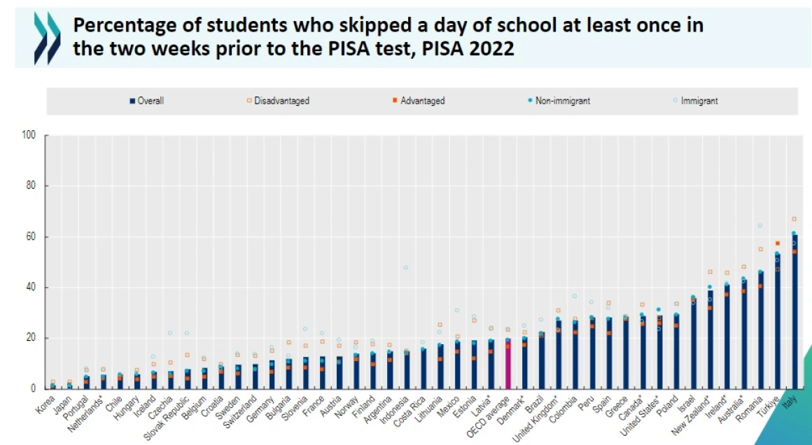Și în special la elevii dezavantajați, aproape 55% au declarat că au chiulit de la școală, iar în cazul elevilor imigranți, procentul a fost de aproximativ 64%. Este destul de ridicat comparativ cu media OCDE, care este de aproximativ 19,8% pentru toți elevii.