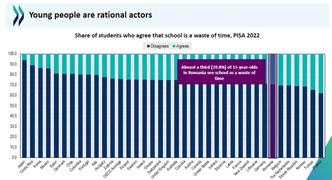 - Cred că este o problemă sistemică. Nu cred că este ceva ce poate fi făcut cu ușurință la un nivel mic. Pentru că dacă ne întoarcem la cifra despre ponderea tinerilor care nu consideră că școala este o utilizare eficientă a timpului lor, cred că există în mod clar lucruri pe care profesorii le pot face la clasă, dar probabil în România nu este cazul unei singure școli. De fapt, este o problemă sistemică.