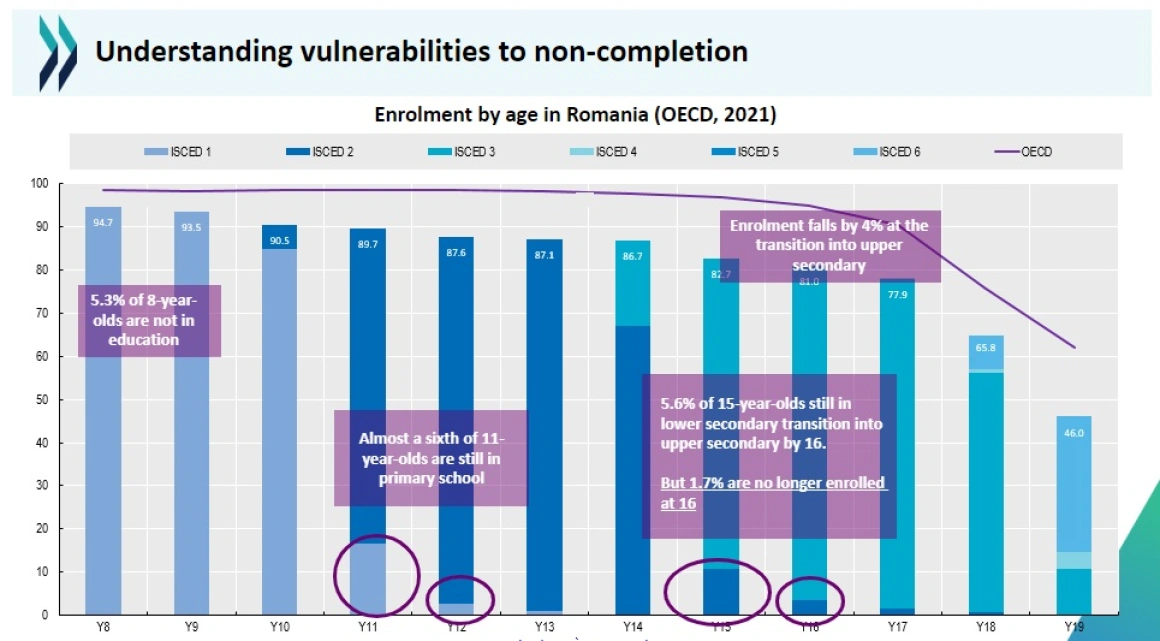 Și apoi, există și o întrebare în ultimul chestionar PISA despre elevii care au lipsit mai mult de trei luni consecutive la orice nivel de școlarizare. Deci, este vorba de cel puțin 60 de zile. La acel moment în OCDE, media era aproximativ 7,6%. Pentru România, cifrele sunt 7,8%, destul de similar cu media OECD.