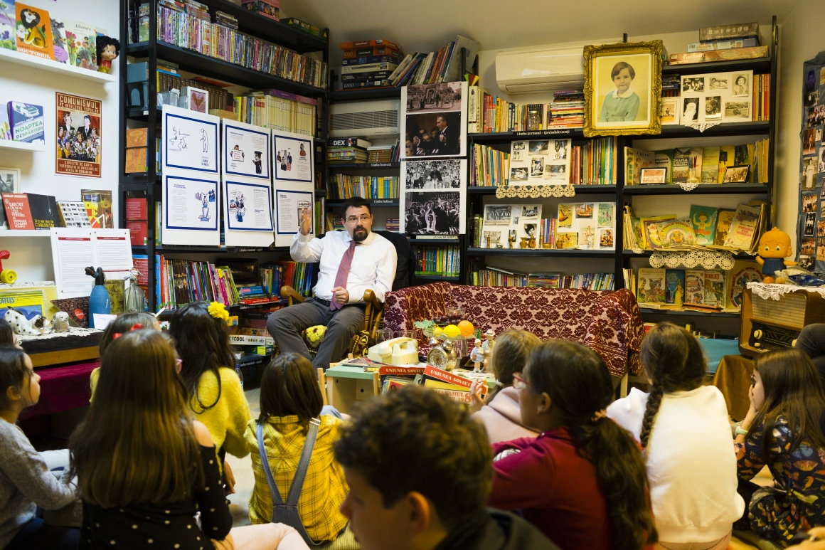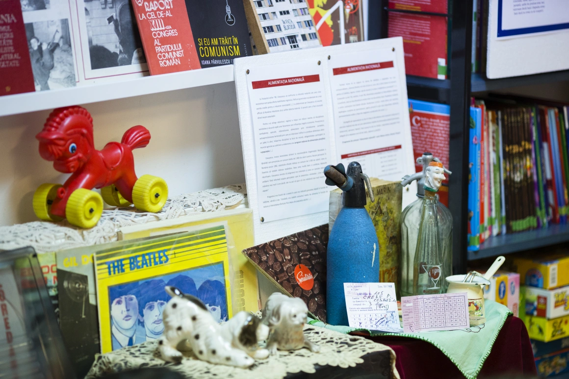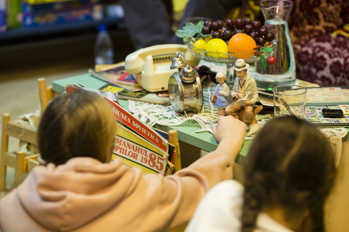 Carla Banu, bibliotecara școlii, a transformat spațiul într-o sufragerie comunistă și o cameră de copil, așa cum arăta ea acum 30 de ani, cu materiale alese de la Muzeul Consumatorului Comunist, cu obiecte aduse de bunici și părinți și cărți din colecția personală. „Pentru copii a fost foarte fain să descopere lucruri printre rafturi, că n-am pus totul la vedere, câte o cutie cu bani de pe vremea aia, fotografii vechi. I-am invitat pe copii să ne descopere pe noi la vârsta lor”.