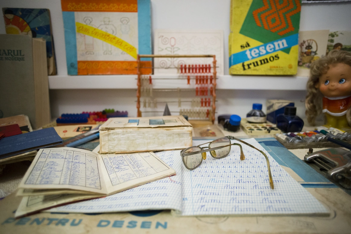 În biblioteca școlii Babel din Timișoara te pierzi printre obiecte de acum 30 de ani: programul TV din ziua de 22 decembrie, jocul Bunul Gospodar (o variantă socialistă de Monopoly), panouri cu fotografii cu copii în uniformă, la serbări școlare sau zile de naștere ținute în apartament, o numărătoare, carnete de elev, echere și rigle de lemn, manuale de citire, culegeri de matematică, abecedarul Albinuța, un macat care acoperă canapeaua, bibelouri, pești de sticlă pe radioul vechi, poze cu Ceaușescu. Pe fundal, se aude vocea Loredanei Groza: „Bună seara, iubite, te-aștept ca și cââând...”.
