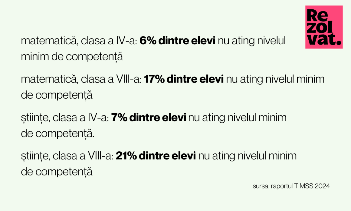 Și raportul TIMSS - Trends in International Mathematics and Science Study confirmă datele analizelor PISA și Brio și Ave. TIMSS evaluează competențele la matematică și științe ale elevilor de clasa a patra și a opta, iar rezultatele arată evoluția copiilor de la un ciclu de învățământ la altul. România a participat alături de alte 58 de sisteme de educație la evaluarea din 2023. Din aproape 300.000 de elevi care au fost testați la matematică și științe, aproape 4.000 sunt de la noi.