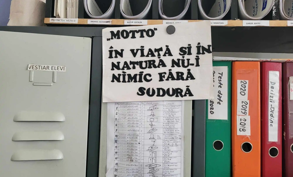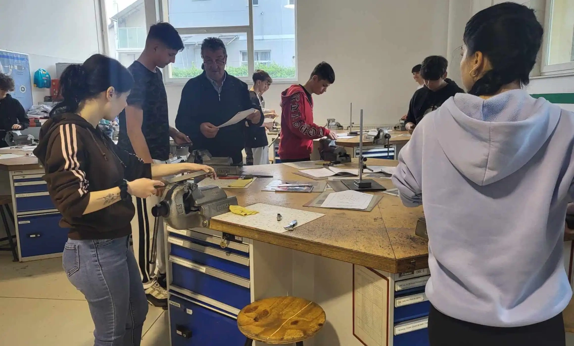În atelierul de lăcătușerie e un huruit continuu. Elevii de clasa a noua, fete și băieți, învață operația de înfiletare. Fiecare are o trusă cu șubler, riglă, compas, dornuri, punctator. Profesorul Viorel Cirimbei trece pe la fiecare.