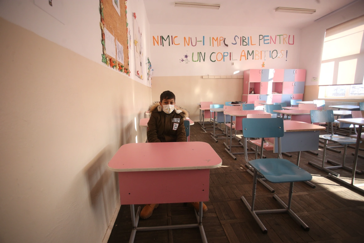 Florin sare câte două trepte o dată până la primul etaj unde are clasa. Băncile în roz și bleu dau impresia unei camere de bebeluș. Florin se așază în banca lui, prima de la ușă, aproape ceremonios. „Stăteam pe mijloc, dar ne-a mutat doamna, că a pus pe o fată pitică acolo”, spune băiatul. Atinge eticheta de pe masă, acum ștearsă, pe care își scrisese numele, parcă să se convingă că totul e la locul lui. Abia așteaptă să se întoarcă. „Mie nu-mi place online acasă, că n-am semnal. Am intrat de cinci-șase ori - așa. Uite, de pe telefonul ăsta”, scoate băiatul un Samsung și ni-l arată.