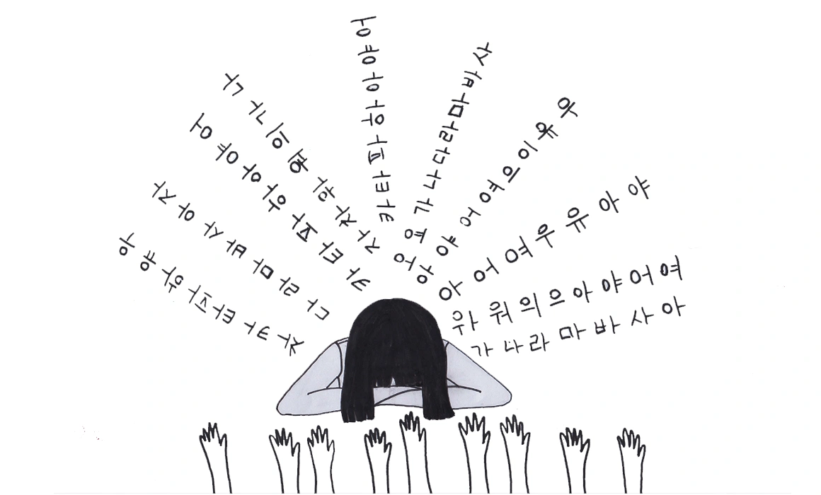 Clasa avea pereții albi, băncile erau puține și lipite între ele, iar eu tremuram de frică pe scaunul de profesor cu spătarul înalt pus în fața tablei magnetice. Ajunsesem cu mai mult de jumătate de oră mai devreme și nu știam dacă ar trebui să-mi scot laptopul pe masă sau nu. Trebuia totuși scos, mi-am zis, pentru că aveam pe el toate fișierele audio de la exercițiile din cartea de pe care urma să predau în următoarele trei luni. Mi-am privit teancul de foi capsate strâmb pe care le-am pus pe mijlocul băncii mele albe așezate în fața celorlalte. Petrecusem ore întregi noaptea trecută încercând să pun alfabetul coreean pe hârtie. Nu aveam suficientă încredere că voi reuși să predau fără ea, așa că îmi mulțumeam în permanență în gând că nu am uitat să o bag în ghiozdan de dimineață.
