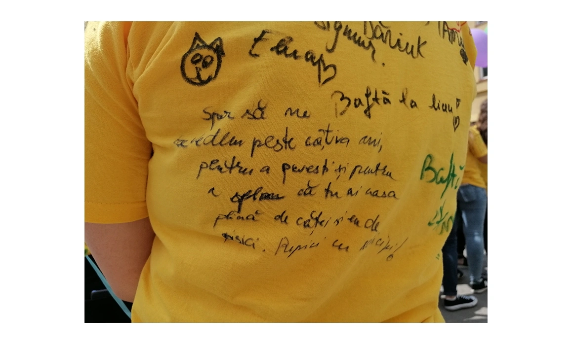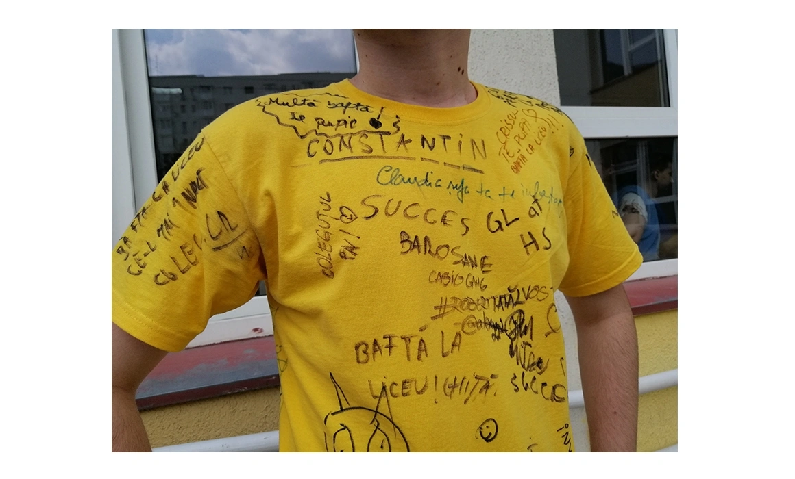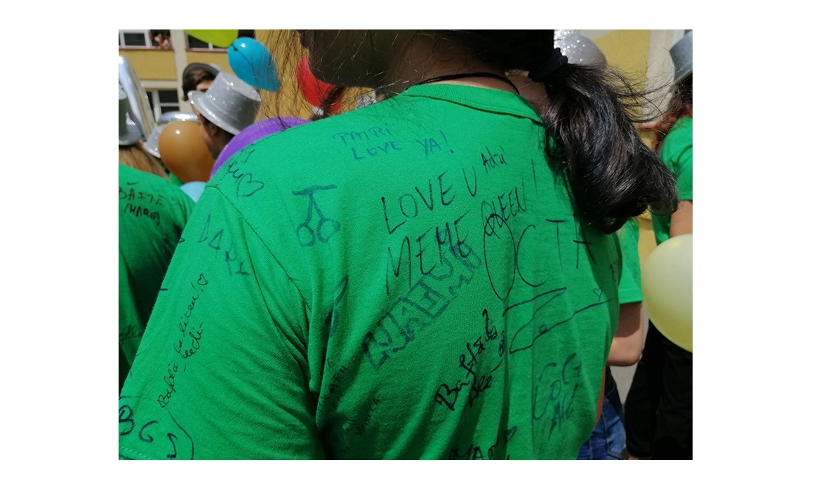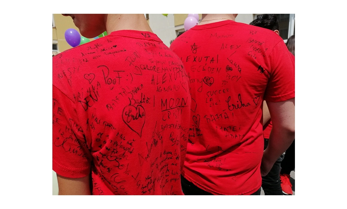 Pe sub tricoul roșu pentru semnături, Alexandra are un tricou negru și o pereche de pantaloni albi, cu dungulițe. Are părul lung, lăsat liber, și poartă foarte puțin rimel și luciu de buze. S-a încălțat cu balerini simpli, din lac. „Colegele mele și-au luat rochii și tocuri pentru că o să mergem să facem poze după festivitate. Eu am vrut să mă simt confortabil, m-am îmbrăcat lejer.” Lejeritatea, așa cum îi spune ea, este unul dintre lucrurile pe care le apreciază în clasa ei. Nu au fost dintotdeauna cel mai unit colectiv, dar s-au apropiat suficient de mult încât să își permită să se comporte natural, să cânte când au chef, să țipe, să râdă zgomotos. „Aș putea să vin și în pijamale și tot nu m-ar critica nimeni. Ne-am obișnuit unii cu alții”, mai spune ea. Îi este teamă că la liceu va fi altfel. Probabil o să treacă ceva timp până să se cunoască cu viitorii colegi și să lege prietenii. Recunoaște, totuși, că este curioasă și chiar un pic nerăbdătoare să înceapă clasa a IX-a. A auzit de la cei mai mari că liceul e cea mai frumoasă perioadă a vieții, că este o experiență de neegalat. Se bucură că a venit și rândul ei.