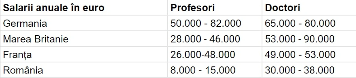 Astfel că un profesor român câștigă de șase ori mai puțin decât unul neamț și de trei ori mai puțin decât unul britanic sau unul din Franța. În același timp, un profesor român cu toate gradele didactice și cu vechime câștigă jumătate cât un medic român.