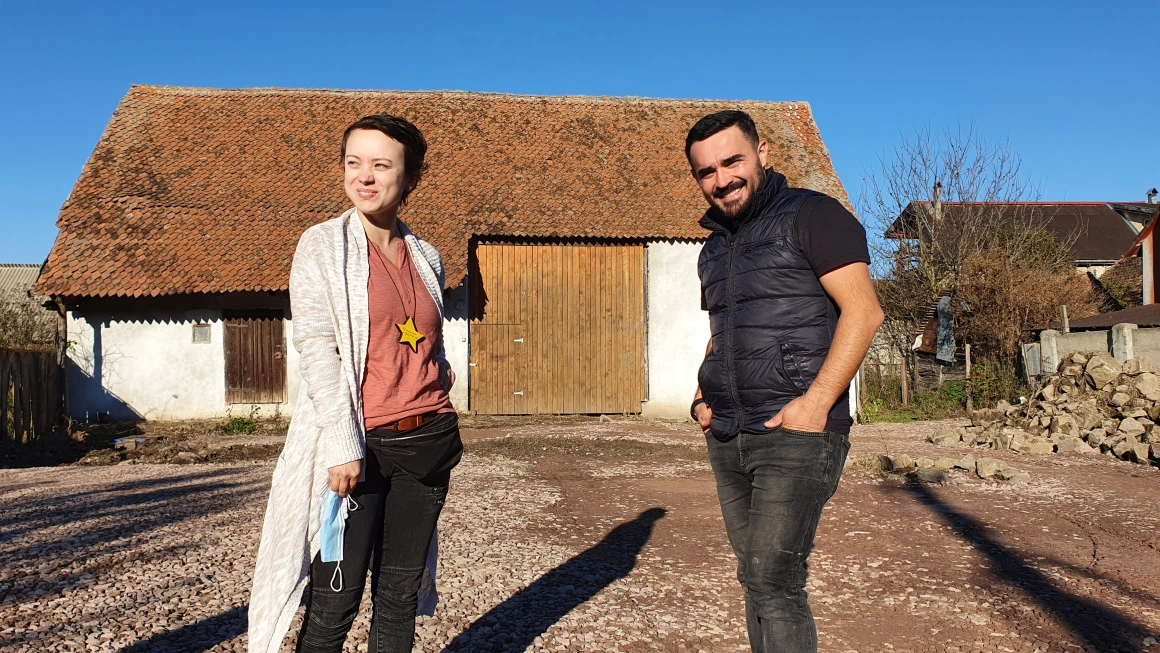 Foto: Natalia Ginghină și Adrian Secal, creatorii Edubuzz, în curtea în care va sta autobuzul educațional