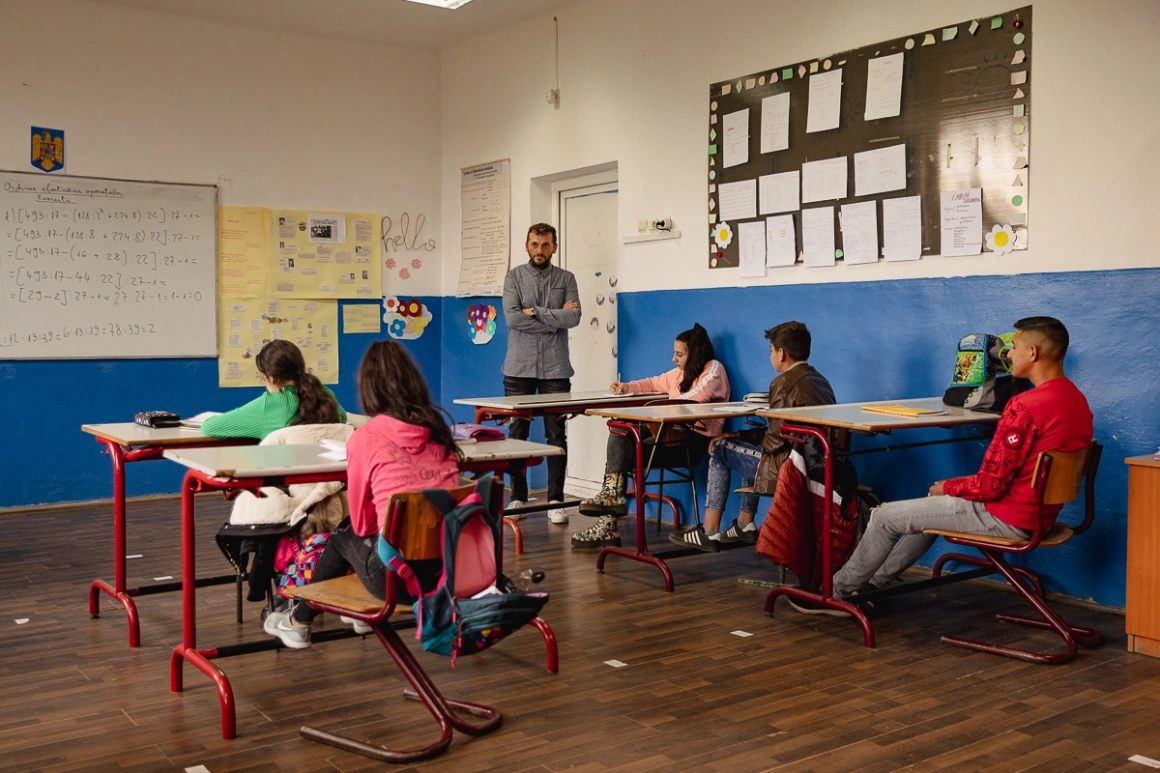 Opt profesori români și romi predau în școala din satul Măguri, Timiș, unde toate orele, cu excepția celor de română și engleză, se desfășoară în limba romani. Pentru oamenii din comunitate – peste 80% sunt romi – să termine un liceu și mai ales o facultate e o victorie. Călin Odă se numără printre cei care au reușit. Absolvent de Politehnică în Timișoara, acum le predă matematică elevilor din instituția în care a învățat și el. S-a întors în sat pentru familia lui, dar și ca să-i țină pe copii aproape de școală. Vrea să ocupe postul de mediator școlar, liber de mult timp, și să-i convingă pe adulții din sat să prioritizeze educația copiilor și să-i lase să învețe. Mai multe despre munca lor, aici.