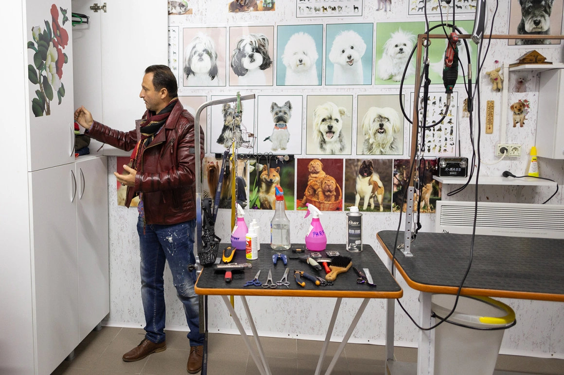 Înainte de plecarea Larisei, părinții ei s-au mutat într-o altă casă, iar George, care are tot 48 de ani și e pensionat, a deschis o frizerie pentru căței în curte, în locul garajului. A decorat spațiul cu postere plastifiate cu rase de câini, a amenajat un loc special în care să fie spălați și o masă pe care să-i poată tunde și a lipit afișe de promovare prin zonă. Vara are și șapte-opt câini pe zi și îl mai ajută și soția, care lucrează la Direcția de Sănătate Publică Pitești.