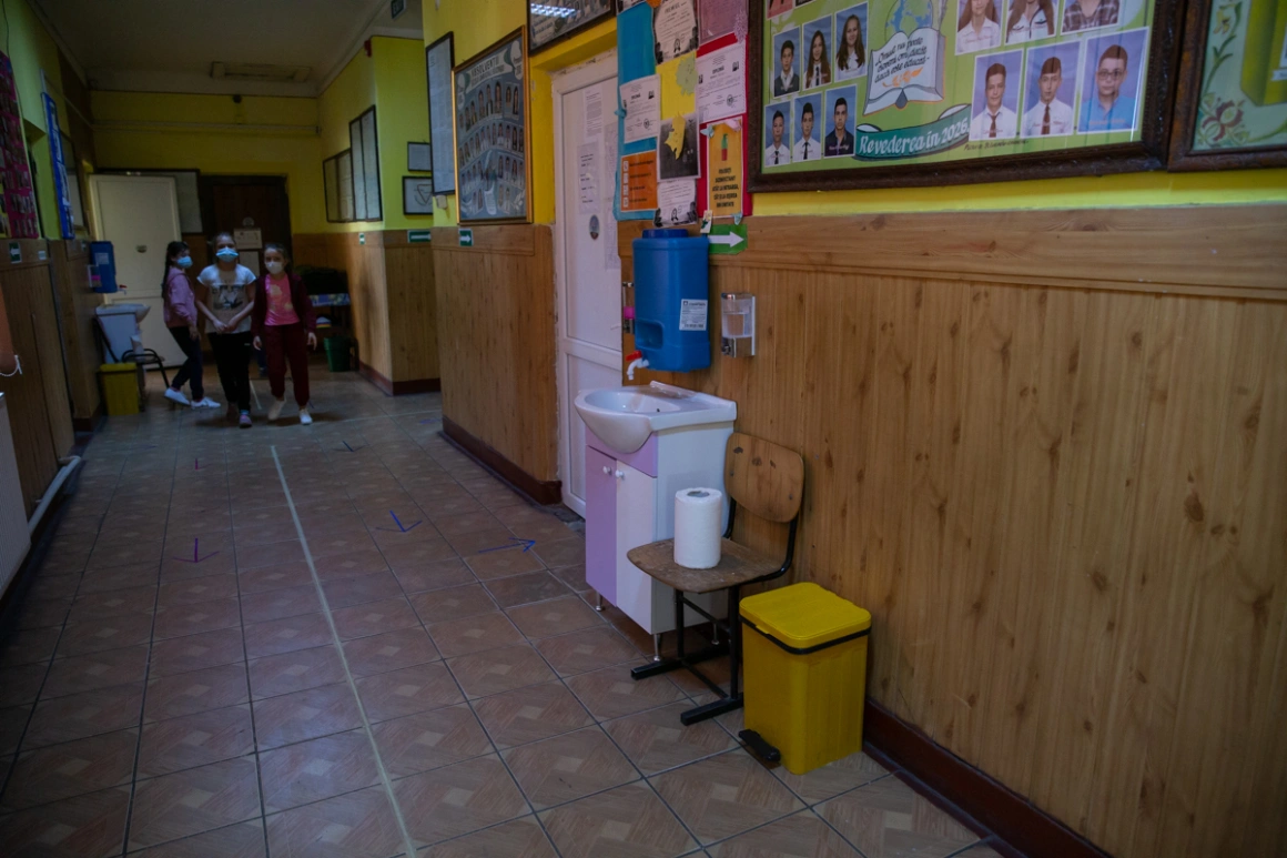 Fetele și băieții merg la WC-ul din curte și se spală pe mâini în holul școlii, acolo unde a fost amenajată o zonă cu lavoare. Au improvizat aceste locuri pentru spălat că să poată redeschide școlile în scenariul verde. O singură chiuvetă are apă curentă. La celelalte două sunt improvizații. Banii pentru ele au fost dați din bugetul școlii.