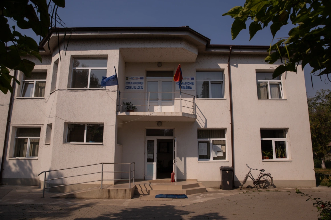 În contrast cu școala, clădirea primăriei din Bucinișu este nouă. Administrația locală are apă curentă și toaletă în interior. Înăuntru podele strălucesc de curățenie.