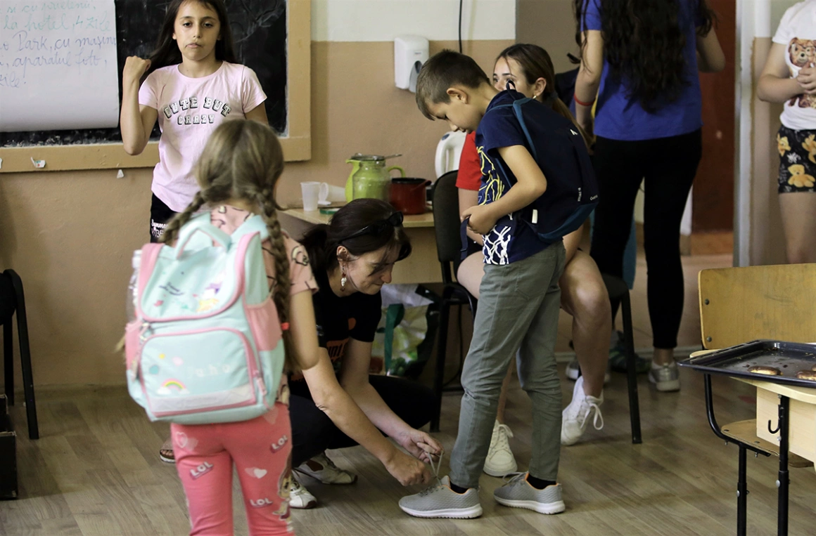 În clasă sunt și mai multe eleve de la Pedagogic venite în practică. Sunt deja foarte sigure pe ele, copiii le ascultă, le urmează. Înainte să primească prânzul, merg cu ele la joacă în curte. Se aleargă, strigă, chicotesc, de parcă ar fi împreună cu surorile lor mai mari. Fetele sunt îmbrăcate estival, în pantaloni scurți și tricou, au părul prins în coadă.