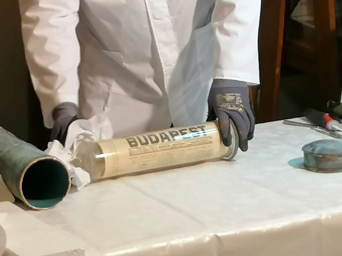 În cilindrul metalic arheologii au găsit mai multe ziare apărute în 1908 în Târgu Mureș și în Budapesta Foto: Agerpres