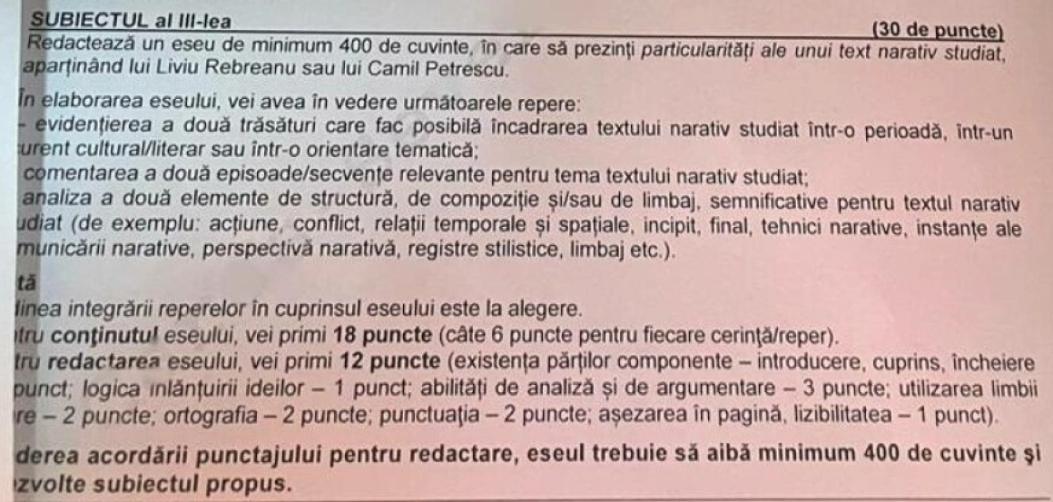 Cei în jur de 130 de mii de elevi care susțin astăzi prima probă a examenului de bacalaureat 2023 au avut la primul subiect de rezolvat mai multe cerințe pe baza unui text de George Călinescu - „Ion Creangă. Viața și opera”. La Subiectul al doilea cerințele s-au bazat pe o poezie de Alexandru Vlahuță, „A mele visuri”. Subiectul al III-lea le-a cerut elevilor de la Real să scrie un eseu în care să prezinte particularitățile unui text narativ studiat aparținând lui Liviu Rebreanu sau Camil Petrescu. Elevii de la Uman în schimb au avut o caracterizare de personaj dintr-o operă la alegere tot din aceiași doi autori.