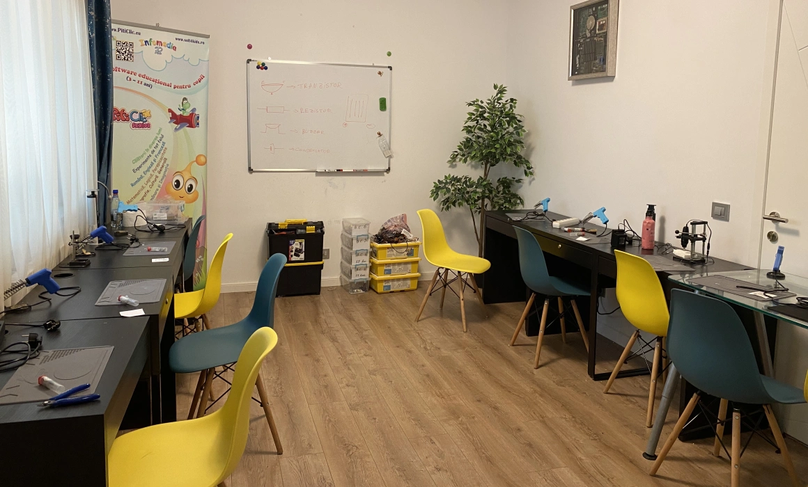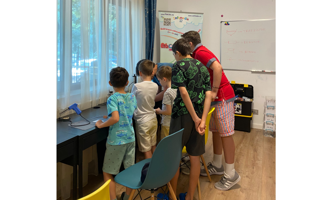 Suntem la Micul Electronist, un proiect care oferă cursuri aplicate de electronică și robotică pentru copiii cu vârste între 7 și 14 ani. Aici, ei învață practic de la experți noțiuni tehnice din electronică, contracost. Copiii deprind și alte abilități: mai multă răbdare, atenție, dexteritate.