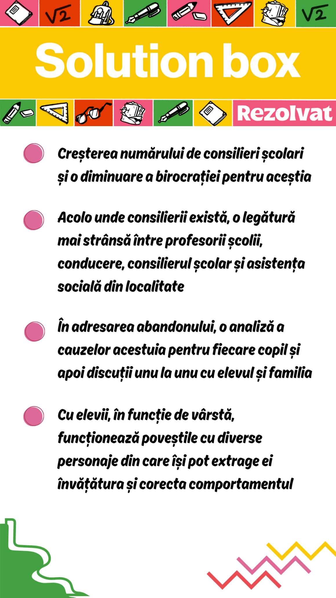 „Nu există o rețetă secretă, nu există aceeași bubă la fiecare rădăcină. Aș putea spune că cel mai des cad în această plasă elevii care au mai multe contexte adunate: situația financiară, lipsa educației în familie sau, dacă nu este asta, anturajul în care elevul intră. Apoi, bullying-ul elevilor, poate notele în scădere și toate acestea duc către acest abandon”, explică aceasta.