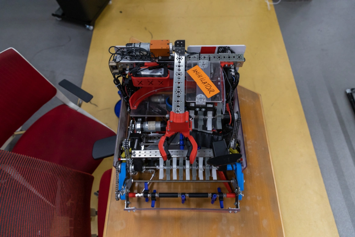 „Știți cumva unde e foarfeca?”, întreabă cu glas ridicat Catrinel, o elevă de-a XII-a, cu breton în formă de inimă, trecând pe lângă mesele împânzite cu sute de șuruburi, piese de plastic și din duraluminiu, mai ușor decât aluminiul. În afară de scule și roboți, ocupă mesele niște imprimante 3D. Într-un robot echipa investește cam 8.500 de euro și îl finalizează în câteva zile sau luni, în funcție de timp și complexitate.