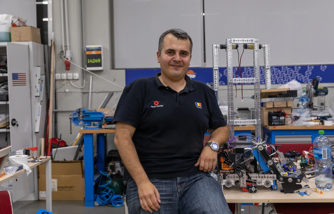 Ionuț a coordonat întâmplător acum zece ani niște elevi înscriși la un concurs de robotică și de-atunci descoperă continuu cu liceenii lumea mașinăriilor. „Ne place emoția concursului, atmosfera”, explică el.