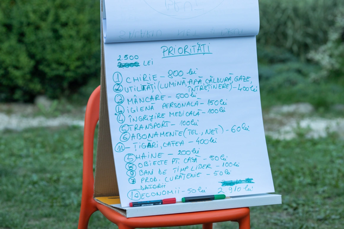 La un atelier de educație financiară, adolescenții s-au așezat pe iarbă și, alături de coordonatorii taberei, s-au gândit la valorile care li se par importante. Fiecare și-a făcut o listă cu primele trei după care se ghidează. Sănătate, familie și fericire, a spus Carmen, când i-a venit rândul să le citească. Pentru Miruna, sănătatea, familia și educația ocupă primele locuri. Niciuna n-a ales banii. Cu ocazia asta, au aflat diferența dintre salariul brut și cel net, dar și cum să-și stabilească prioritățile, dacă au un venit lunar de aproximativ 2.500 de lei.