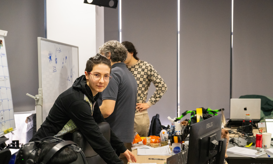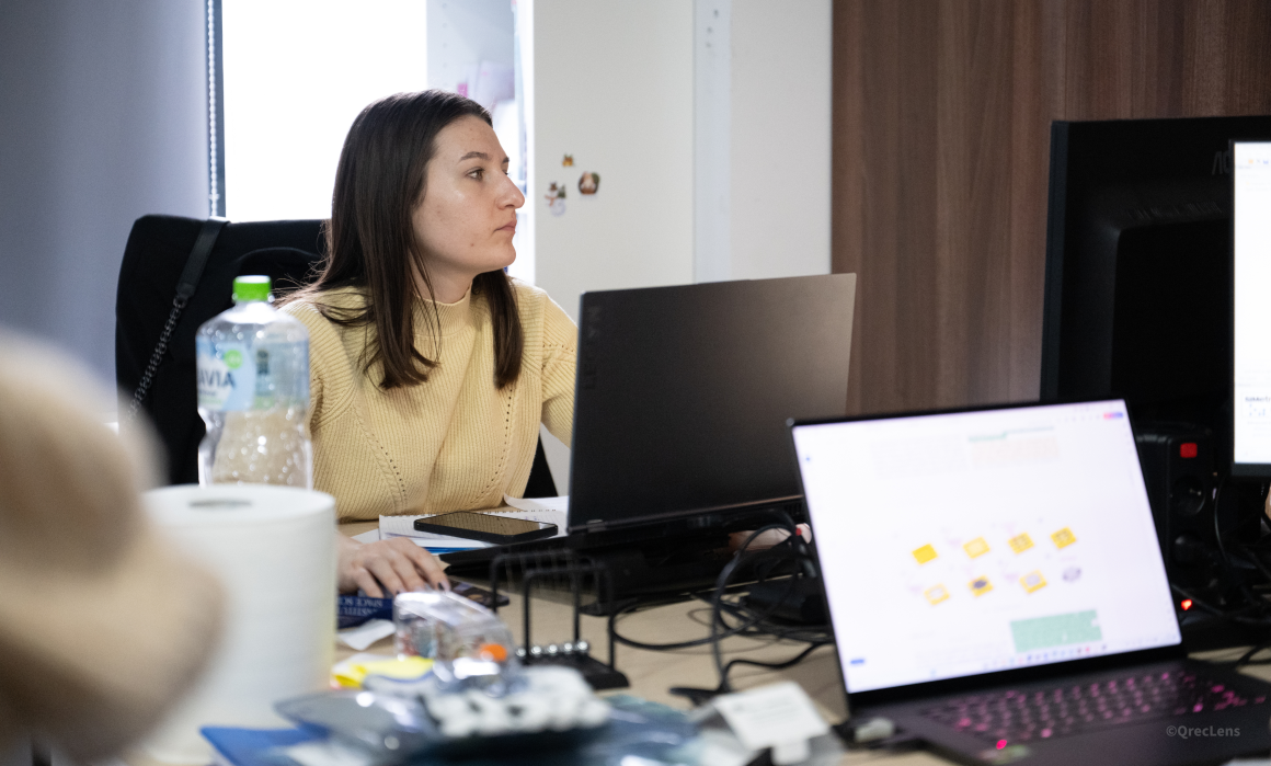 În celălalt capăt al biroului, Monica, 26 de ani, meșterește la un senzor: pe un pătrat făcut la imprimanta 3D, lipește un material portocaliu tăiat în formă de plus. Monica este inginera grupului, „dacă se strică ceva, în 5 minute îl avem înapoi reparat”. A terminat Inginerie Aerospațială la Politehnică, a urmat niște cursuri ESA și este interesată de partea teoretică a științei.