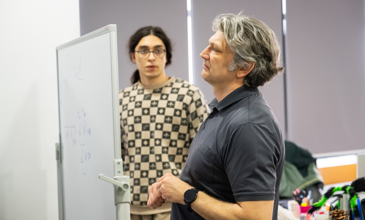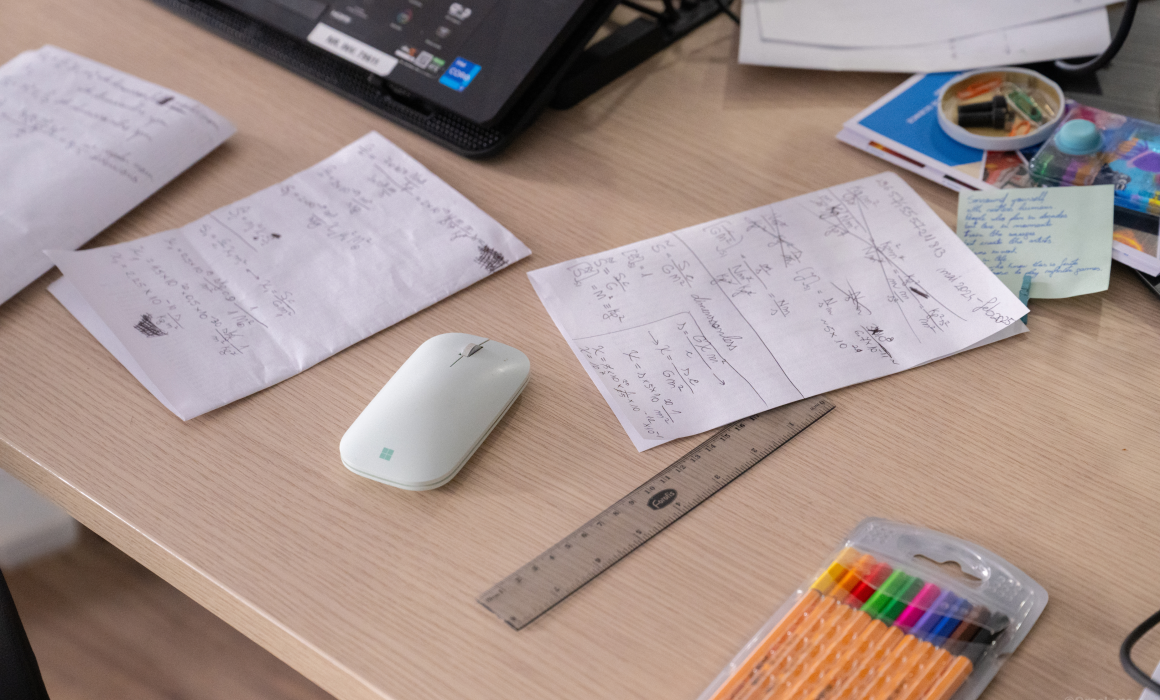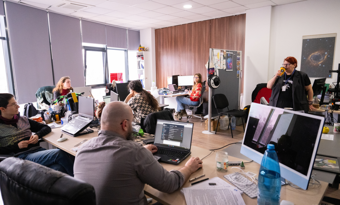 Vineri, la început de februarie, e o zi ceva mai liniștită în Institut. Când intri în biroul echipei ASPACE-Q, dai de chipuri tinere care răsar de după ecrane, table pe care sunt scrise formule complicate cu cifre, litere și paranteze, o machetă a sistemului solar și cât cuprind rafturile - cărți de fizică, astrofizică și cosmologie.