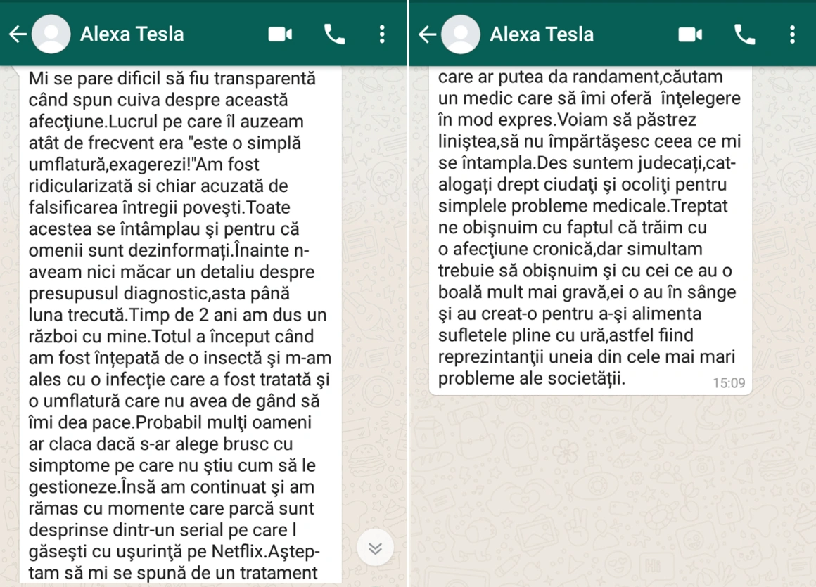Așa că nu avea de ce să le explice prin ce trece. Alexa vorbea doar cu Găbița, prietena ei. Îi scria la 3 dimineața pe WhatsApp gândurile pe care simțea nevoia să le împărtășească. Scrola, ștergea, rescria și apăsa send când simțea că a reușit să pună în cuvinte ce simțea:
